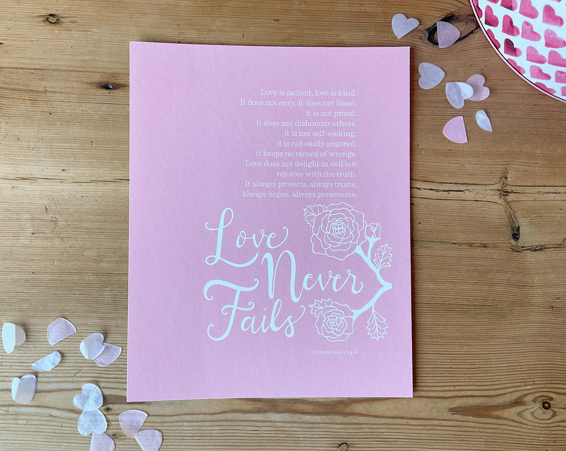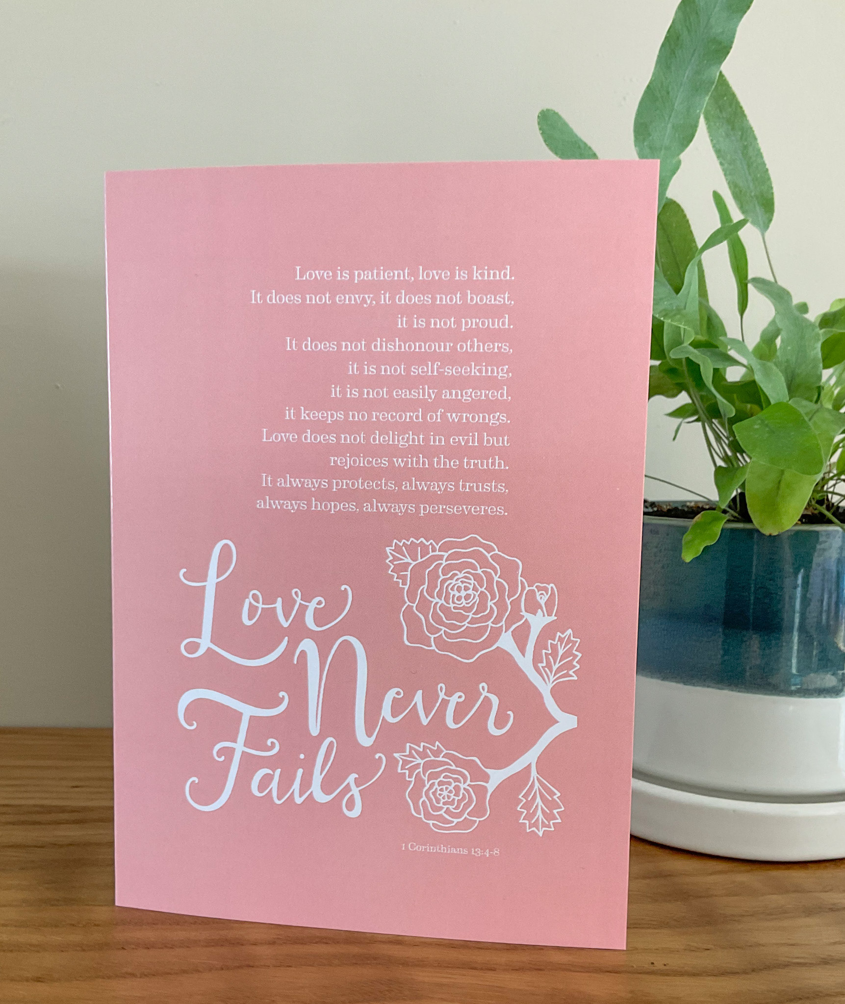 An illustrated Bible quote, 1 Corinthians 13, Love Never Fails.